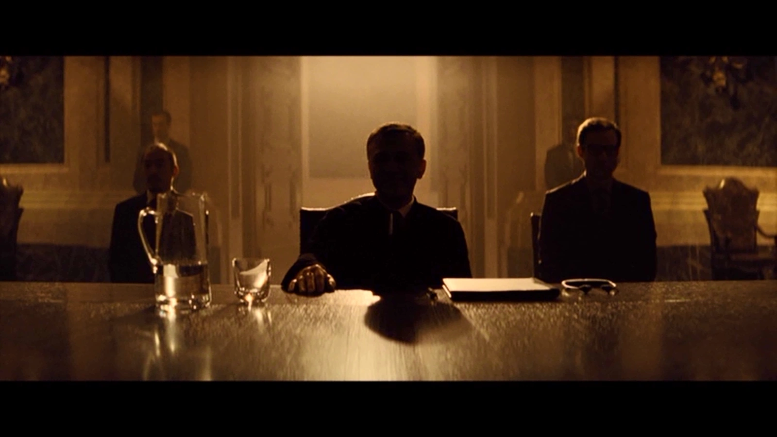 BLOFELD: "Ja, genau! Es hat sich ein hübsches Muster entwickelt – du mischt dich in meine Welt ein, ich zerstöre die deine! Oder glaubst du, es war Zufall, dass alle Frauen in deinem Leben am Ende tot waren? Vesper Lynd zum Beispiel! … Und dann natürlich deine geliebte M! von uns gegangen für immer! Ich! Das war alles ich, James! Immer bin ich es gewesen, der Urheber all deiner Schmerzen!"