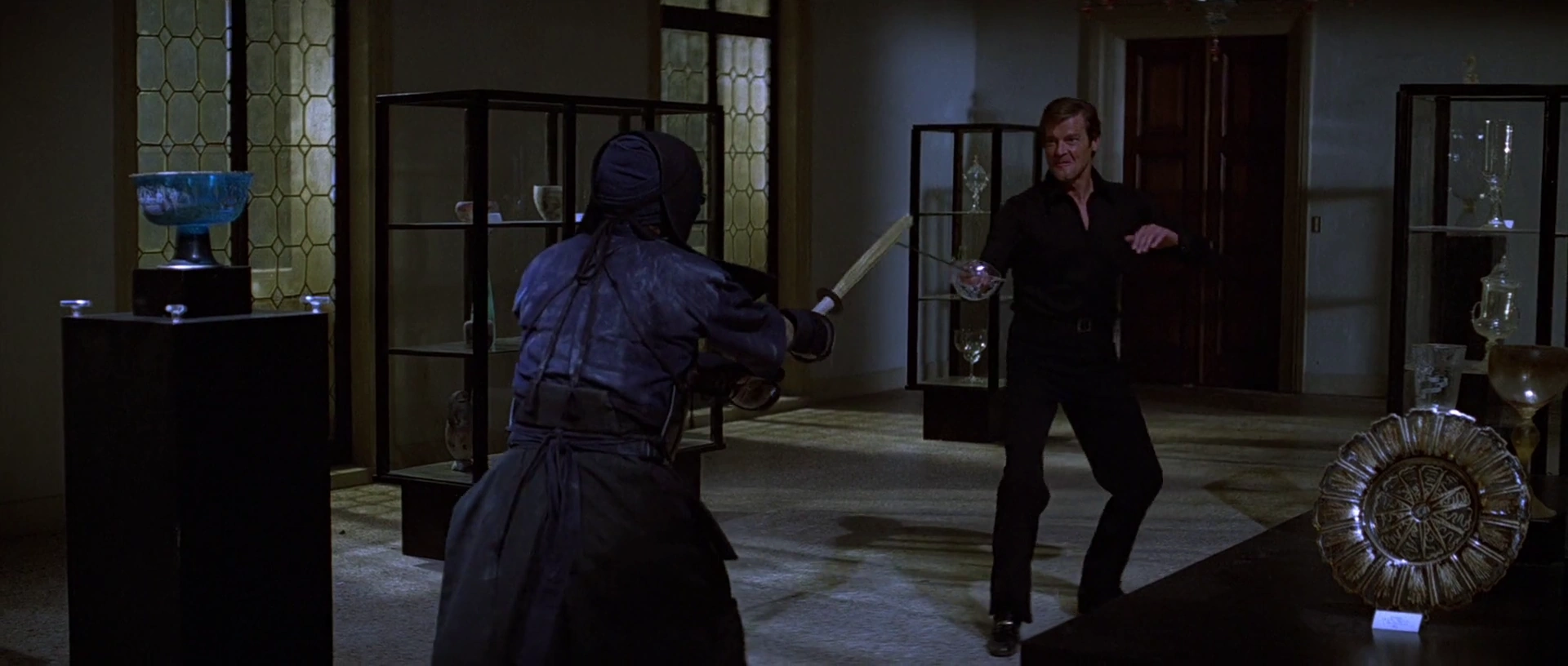 Chang affrontant Bond dans le magasin de verrerie de Drax.