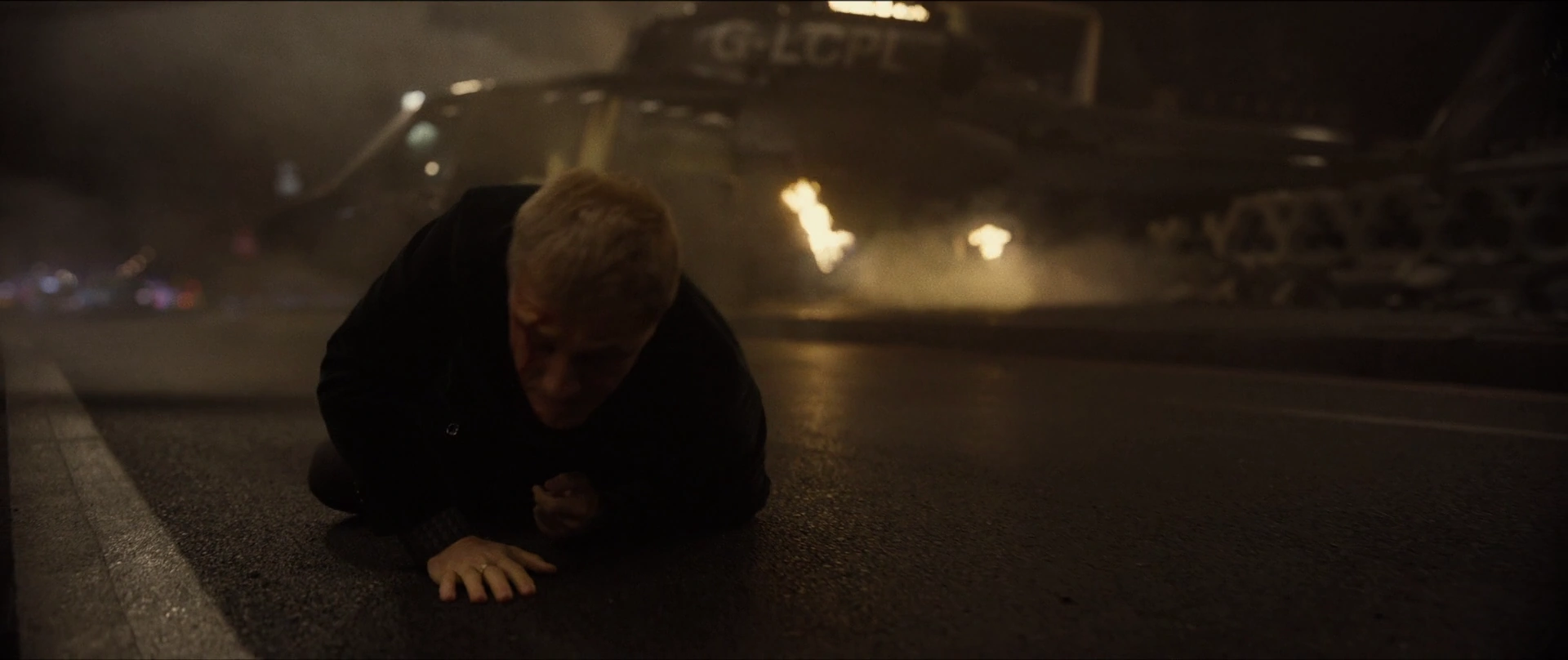 Blofeld essayant de s'enfuir en rampant sur le pont de Westminster.