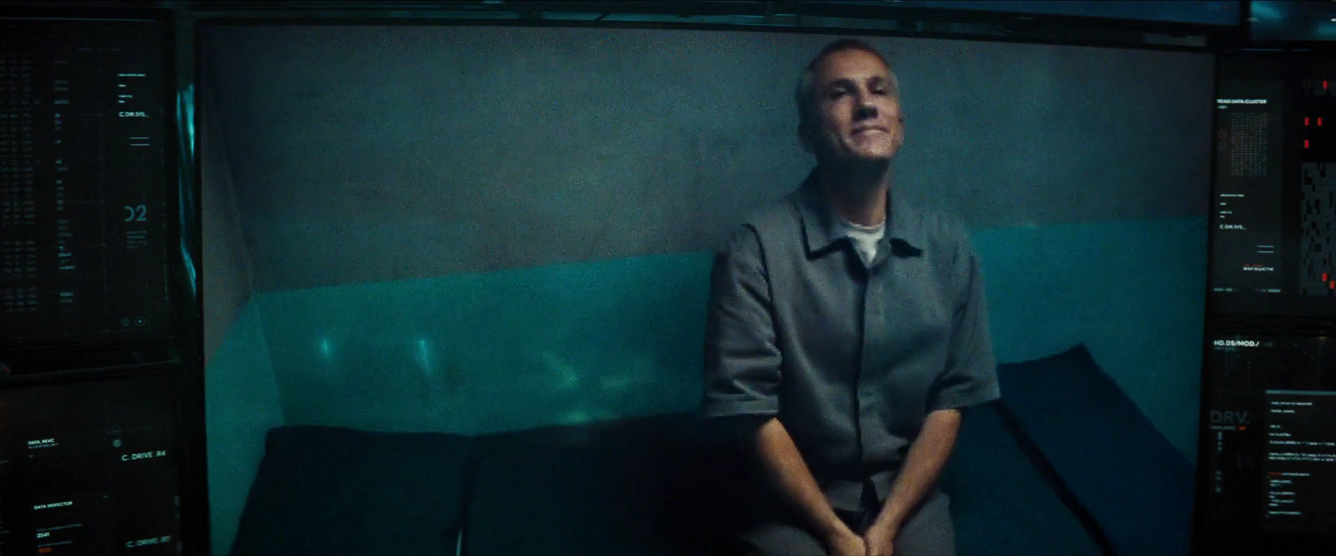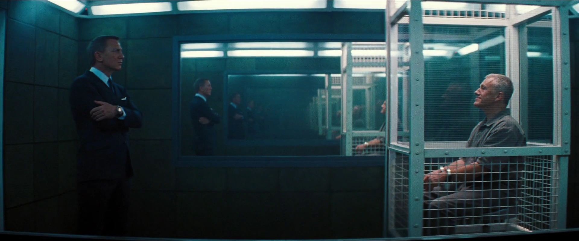 À l'aide de perceuses installées à la chaise qu'il contrôle avec un ordinateur, Blofeld déclare son intention de torturer Bond en perçant son crâne, siège de son âme, ce qui le priverait de sa capacité à reconnaître les visages, avant de détruire son cortex visuel, ce qui le rendrait complètement aveugle. Tout en faisant cela, il révèle sa nouvelle identité à Bond, qui ne le connaissait que sous le nom de Franz Oberhauser jusqu'à présent. 007 est sauvé par Madeleine, qui lance la montre explosive de l'espion sur l'ordinateur de Blofeld, le faisant exploser et projetant l'infâme terroriste à travers la pièce. Dans le chaos qui s'ensuit, Bond s'échappe et tire sur une conduite de carburant, faisant exploser tout le complexe. Blofeld survit miraculeusement à l'incendie, mais est gravement défiguré du côté droit du visage et aveugle de l'œil droit.