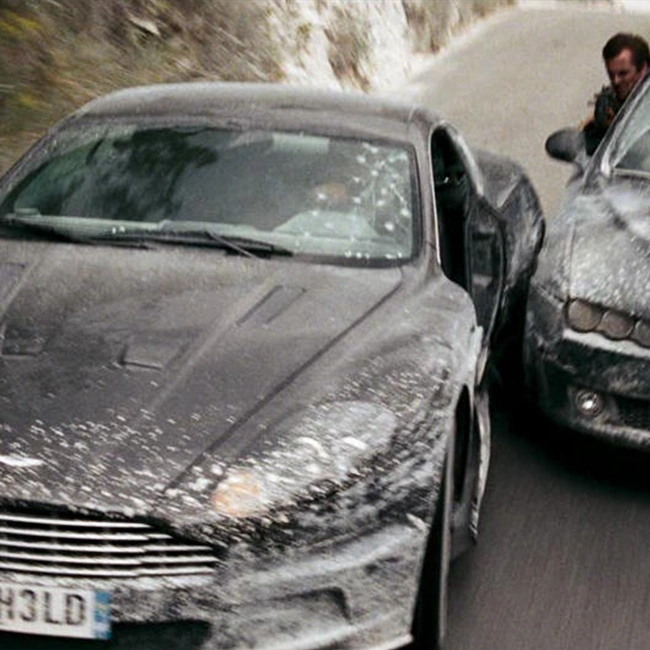 Aston Martin delivered two working ‘hero’ cars to the film. As well as the two ‘hero’ cars, Aston Martin had to prepare three former development DB9’s for use as DBS look-a-like stunt cars. Also a white prototype DB9 manual was supplied to the film crew so that the stunt drivers had something to practice with.[1]