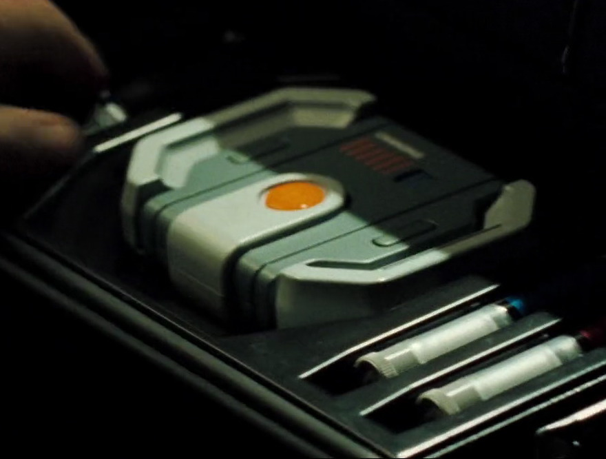 Portable Implant Equipment - A suitcase equipped with a portable scanner and a gun-like device for implanting a homing beacon under the skin. After the beacon is implanted, the scanner confirms that it is functional. The beacon continuously monitors the user's location and vitals. |