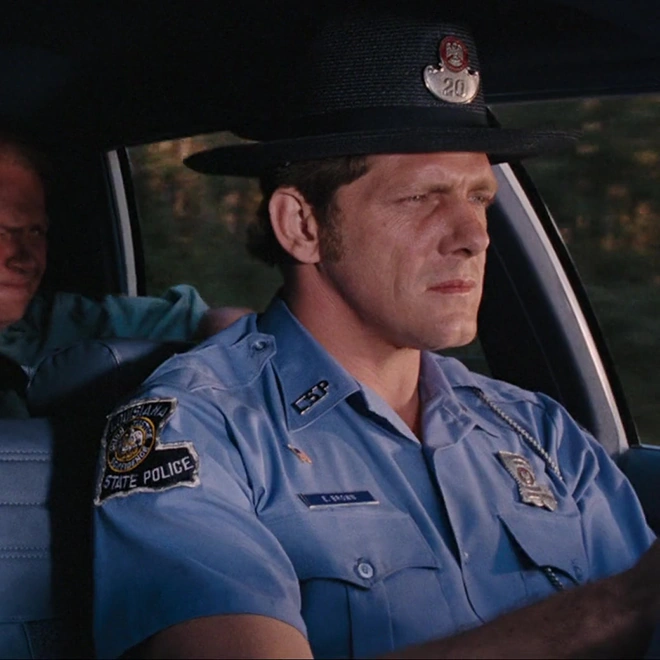 Eddie and his partner are helping Sheriff J.W. Pepper to catch Bond and the others on the river. But Bond suddenly jump with his boat cross the road and they crashed with the other cars.
