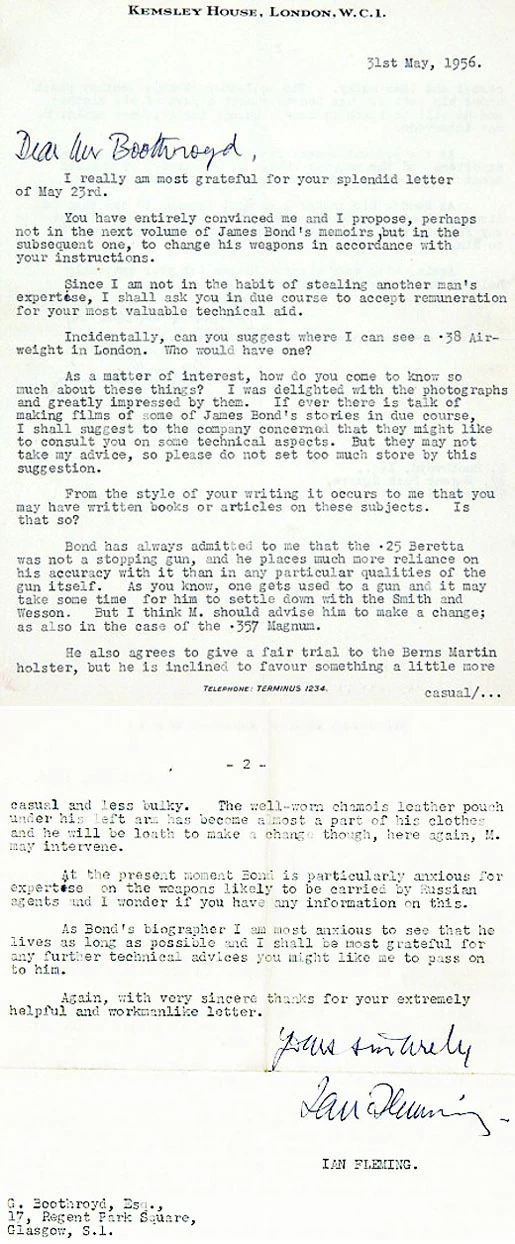 Example of Fleming's conceit of a real-life 007 in a letter to Geoffrey Boothroyd (31st May, 1956).