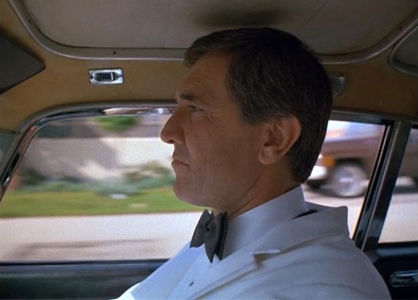 Lazenby's special guest appearance began as the show's protagonist, Napoleon Solo (with a Russian ballerina in the passenger seat), was engaged in a car chase through the streets of Las Vegas, pursued by armed men. As they speed through an intersection, past his Aston Martin DB5 (complete with "JB" license plates), Lazenby's character recognizes Solo as a fellow spy and dutifully sets off in pursuit.