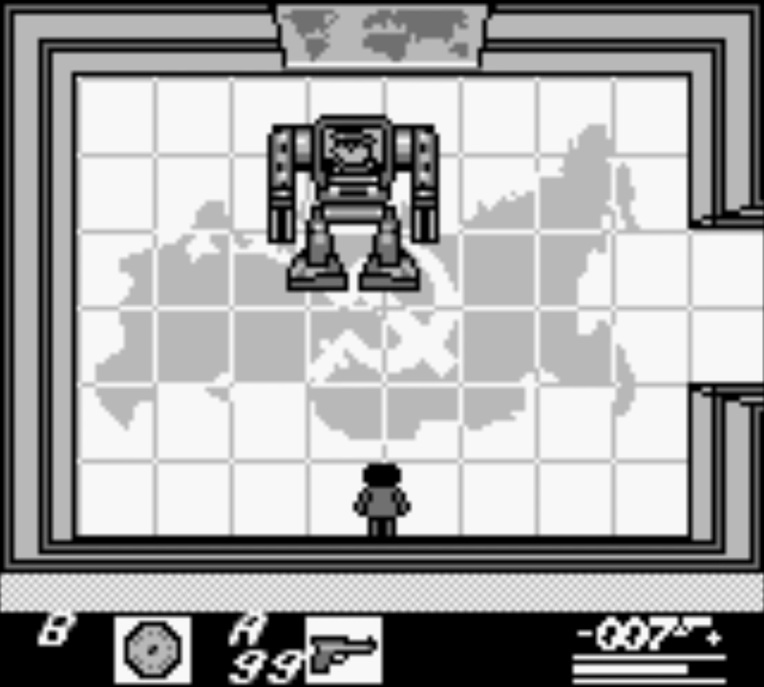 The gameplay of James Bond 007 is presented from a top-down perspective.[1] As James Bond, the player controls an arsenal of weapons and items. Bond must use items at the appropriate place and time to either sneak past impossible odds or to solve a mission. The player can save up to three games and/or delete them. The player can also perform fist and karate moves. The game is played across 11 levels,[2] and also incorporates gambling minigame, such as Baccarat and Blackjack. The game is presented in black and white, as it was developed for the original Game Boy.