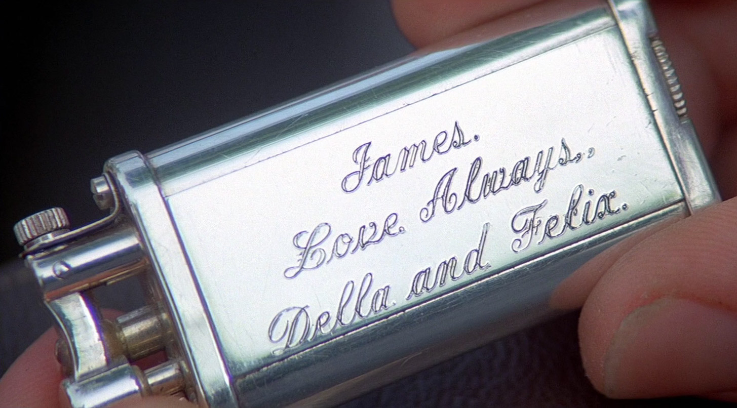 Leiter Lighter - A gift from Felix Leiter and Della on the occasion of their wedding. It is an inscribed cigarette lighter that generates a huge burst of flame. Bond shows Sanchez the lighter to explain why he set about destroying his criminal empire, before setting the gasoline-drenched drug lord alight.