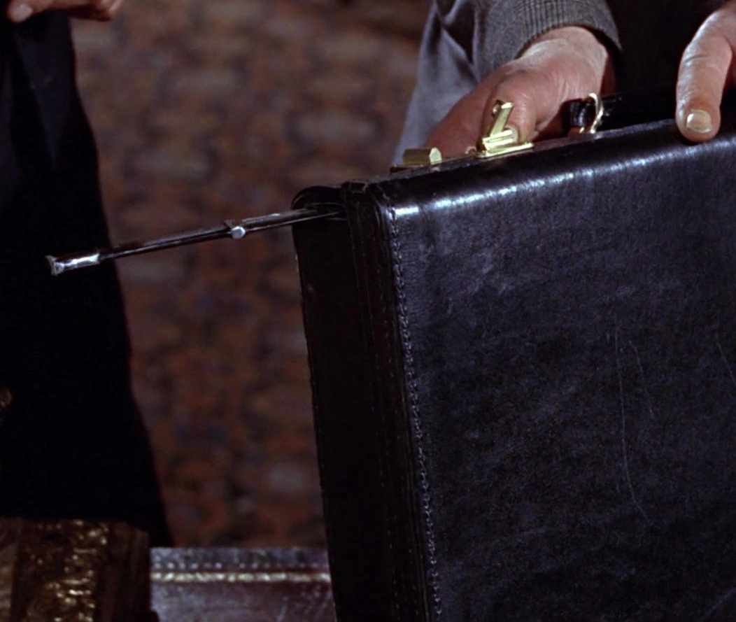 Attaché Case - This is Bond's first real film gadget. This briefcase given to Bond by Q Branch contains a Folding Sniper Rifle inside while ammunition, a knife and fifty gold sovereigns are contained in secret compartments accessible on the outside of the case. In addition, there is a safety mechanism that will detonate a Gas Bomb in the briefcase if opened improperly. This case is almost identical to the one described in Fleming's novel except the book added a Cyanide capsule which Bond was to use to commit suicide upon capture (Bond immediately flushes it down a toilet).