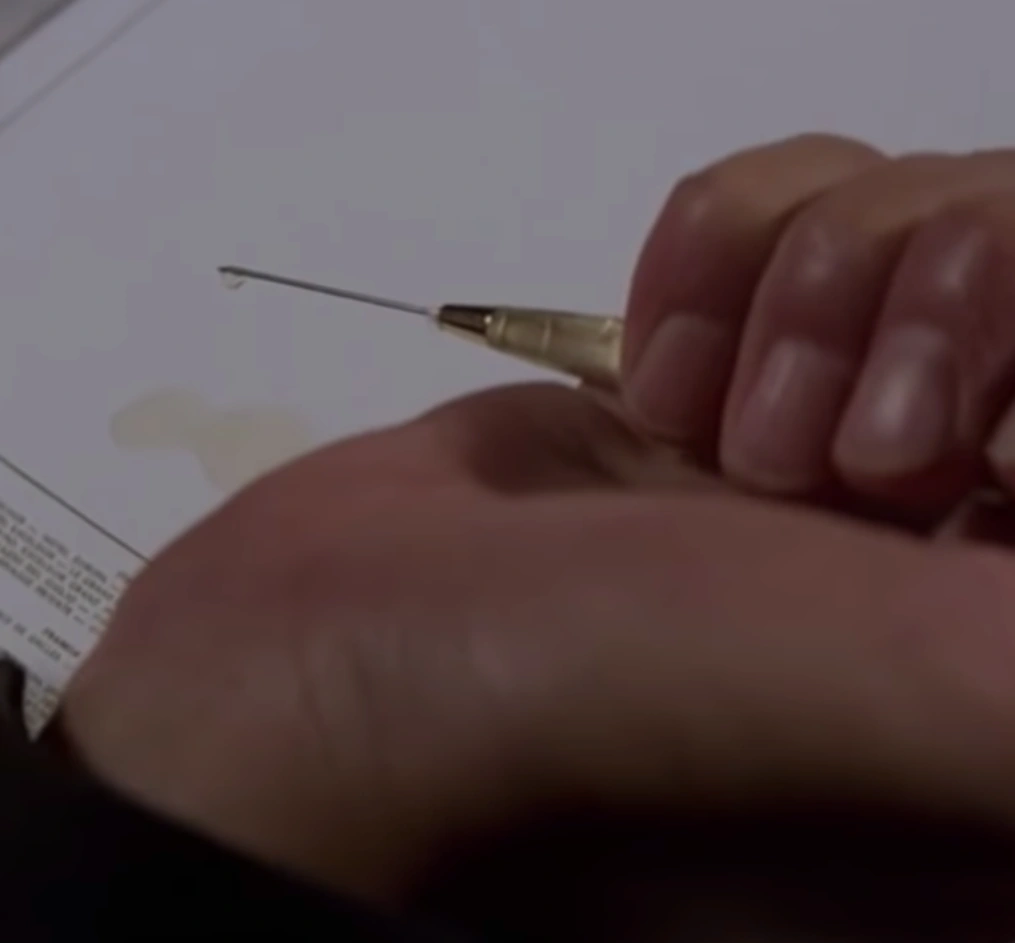 Poison Pen - CIA Agent Holly Goodhead carries a number of gadgets of her own, including a pen with a retractable poison needle. Activated by clicking the top of the pen.