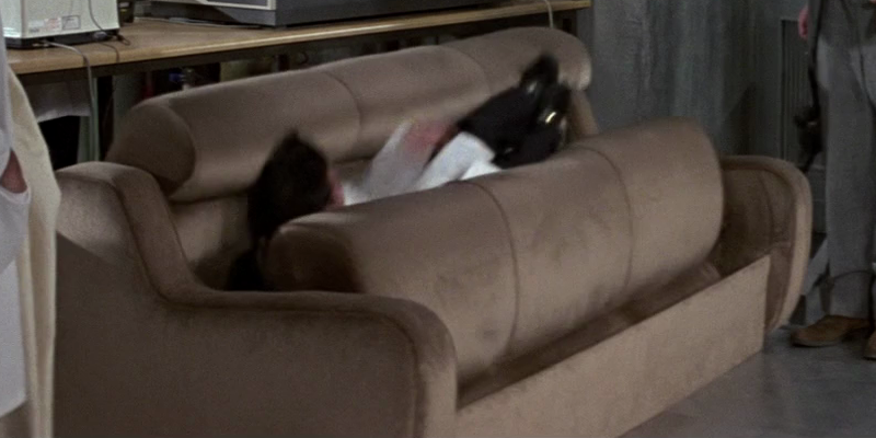 Revolving Couch - Q is also testing a sofa that swallows whoever sits on it.