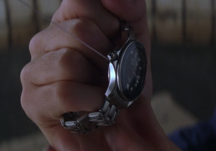 Wristwatch grapple - A modified Omega Seamaster wristwatch. Contains: 1) Grappling hook with fifty feet of high-tensile micro-filament, able to support 800 pounds of weight. 2) A high intensity lighted bezel.