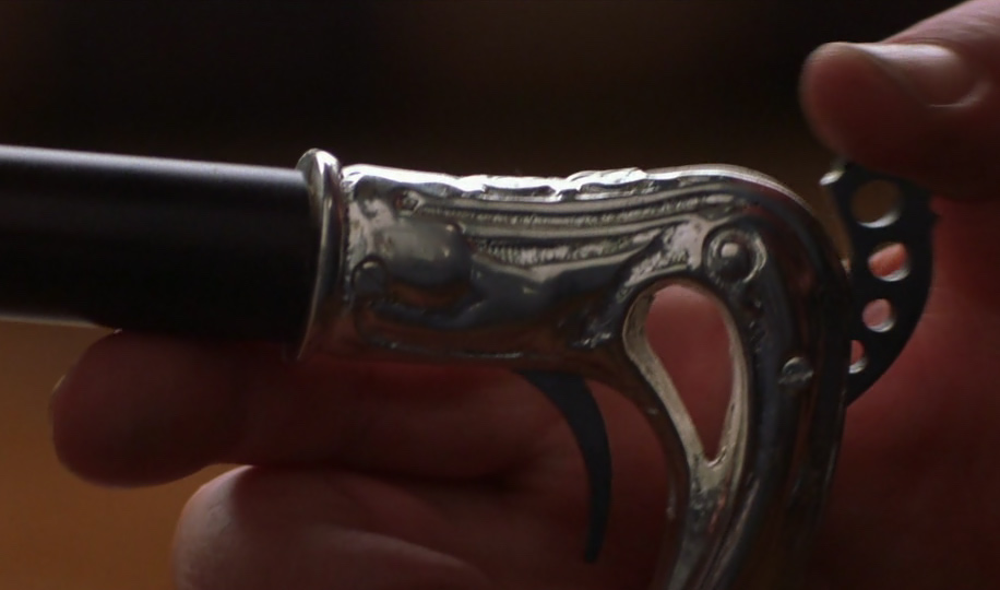 Golden Gun - Scaramanga's titular weapon of choice. The gun can be assembled and disassembled into a gold cigarette lighter, a gold cigarette case, a gold cuff link, and a gold pen to evade security. The bullet is concealed on his belt's golden buckle.