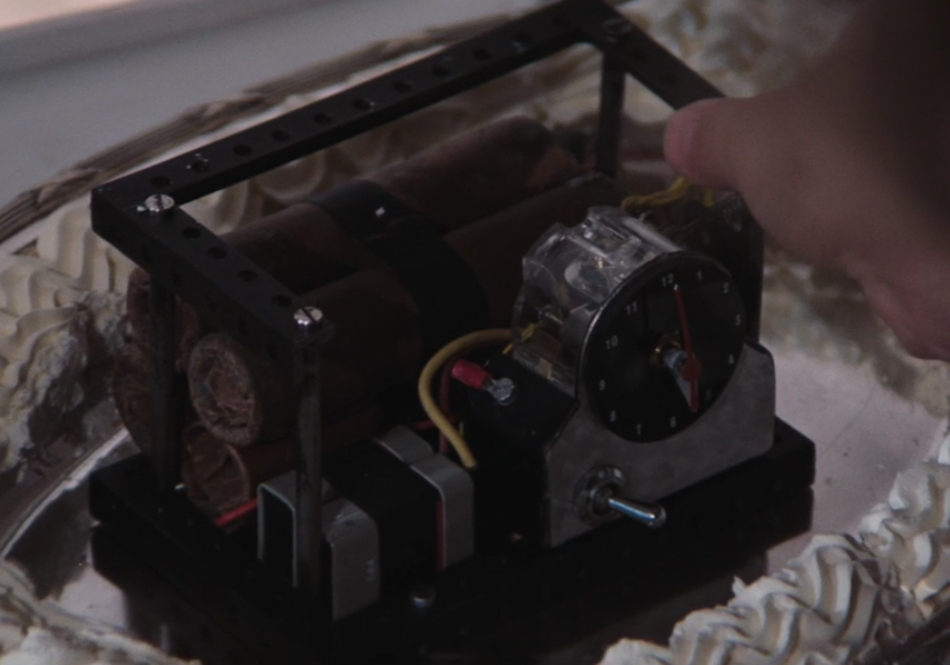 La Bombe Surprise - "Cake" with an "explosive filling", actually a domed shell covered in cake icing covering a small explosive device with a timer. Used by Mr. Wint and Mr. Kidd, and unsuccessfully deployed against Bond. The bomb ended up being tied to Mr. Wint's rear end and tossed overboard, with explosive results.