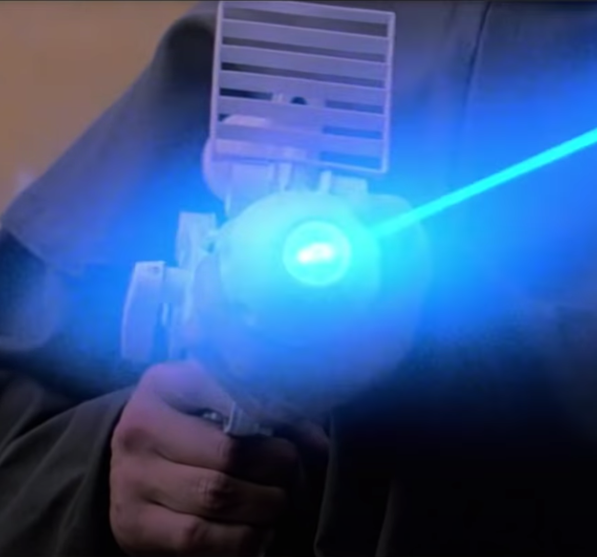 Industrial Laser - Used by Goldfinger trying to kill Bond. Powerful enough to put a laser dot on the moon, but at very close range able to cut through steel. This laser was later used to cut open the vault of Fort Knox. This film showcases the very first of its kind, as this weapon takes on various forms throughout the James Bond series.