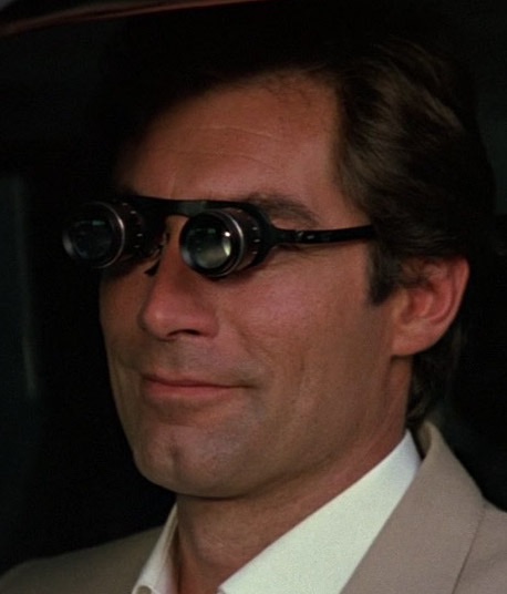 Miniature Binoculars - A pair of miniature binoculars contained on normal looking eye-glass frames. When Bond is in Tangiers, he follows Koskov’s car after a conference and uses the glasses to spy on him from a distance.