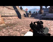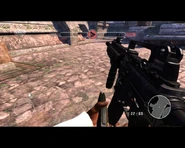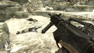 It fires 5.56mm NATO ammunition and comes standard with an R.I.S.-styled rail handguard and vertical foregrip. It can be outfitted with a suppressor, an EOTech sight, and laser sight in the single player missions only.