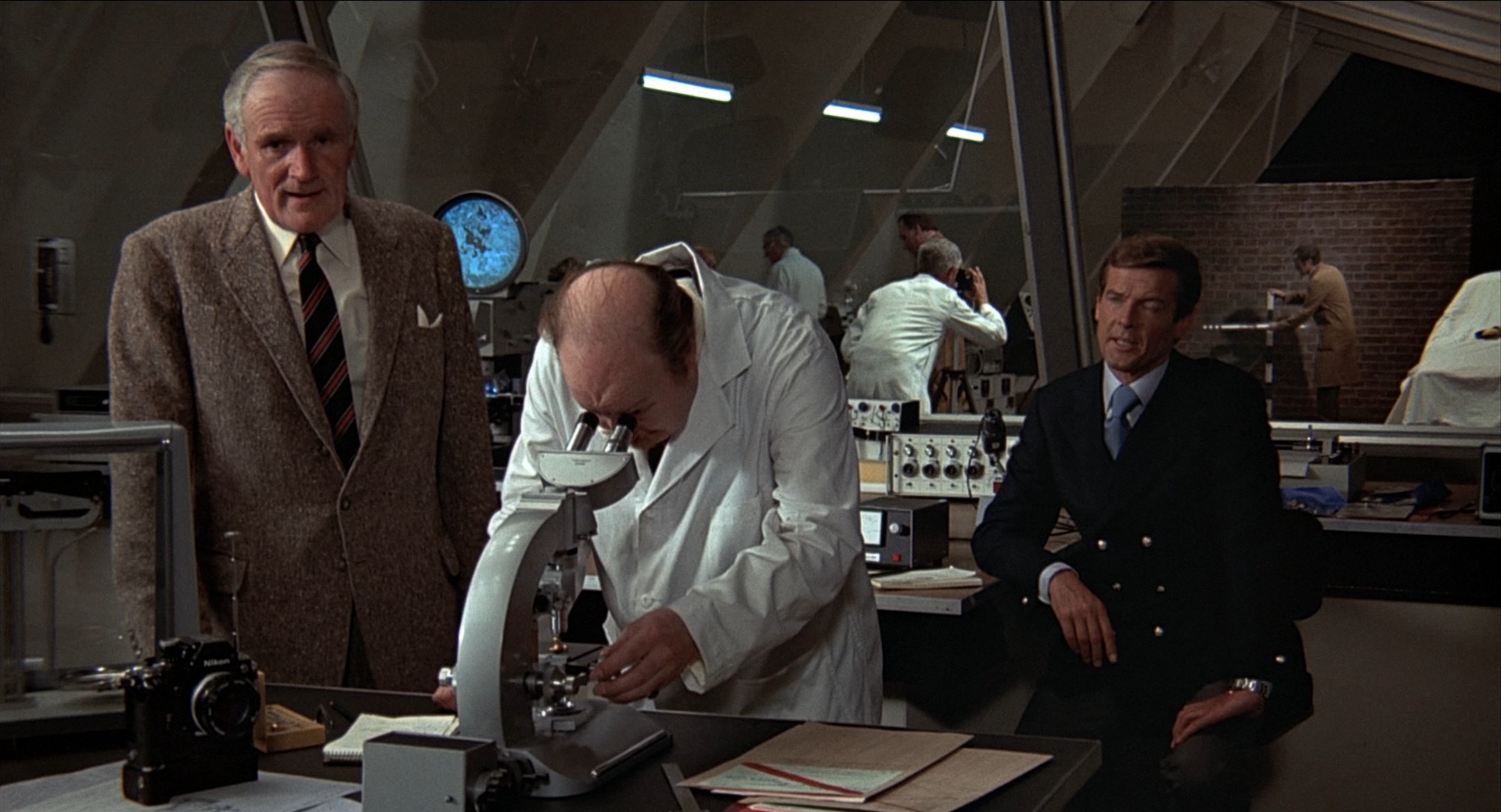 Q temporarily operates out of a hidden workshop in Egypt where he is trialing several gadgets, including the Tea Tray Guillotine, capable of decapitating a dummy. James Bond and his Soviet counterpart Anya Amasova seek out his assistance when their recovered Microfilm Plans turn out to be incomplete. Analysing the film, Q and his team determine that one of its plans was drafted in Italy and further analysis by Bond reveals a partially concealed stamp of the Stromberg Shipping company, narrowing the search to Karl Stromberg's marine laboratory in Sardinia. On arriving in Sardinia, Q delivers Bond's new Lotus Esprit by ferry and is greeted by Anya as "Major Boothroyd". He cautions Bond and attempts to explain the vehicle's features to him, but is promptly cut off in mid-sentence by the spy's "Q, have I ever let you down?". As he throws the Esprit into gear, the frustrated quartermaster slams the driver's door shut, retorting "frequently!" Later, at the end of the film, Q was among M and KGB General Gogol to see 007 and Amasova in the escape pod's bed; the first of several awkward moments in the film series.